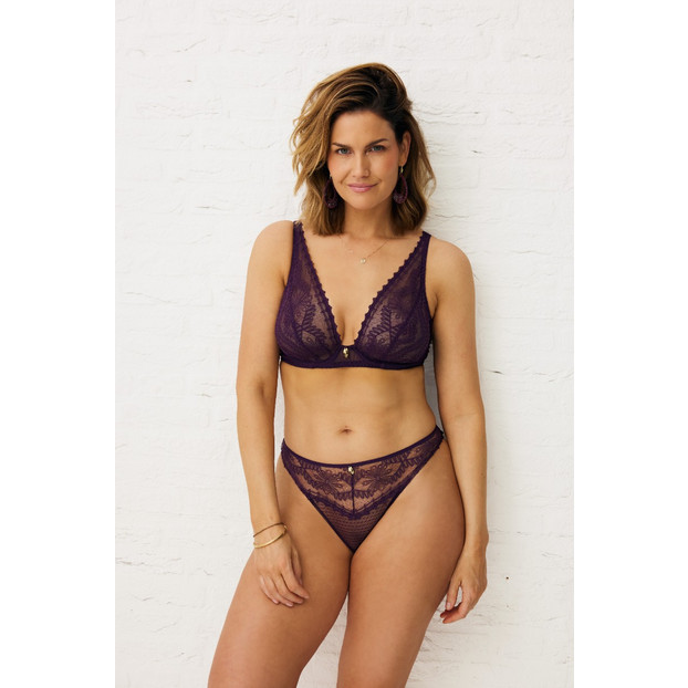 De Mystery of Love plunge BH van Aubade is uitgevoerd in de kleur Plum. Deze paarse BH benadrukt je vrouwelijkheid met fijne kanten details en een sensuele, comfortabele pasvorm. De laag uitgesneden cups liften en centreren de borsten voor een sensueel decolleté. Gouden accenten en de geschulpte randen geven de BH een luxe uitstraling. Door het lichte kant is de huid deels zichtbaar. Combineer met een bijpassende slip uit de Mystery Of Love collectie.