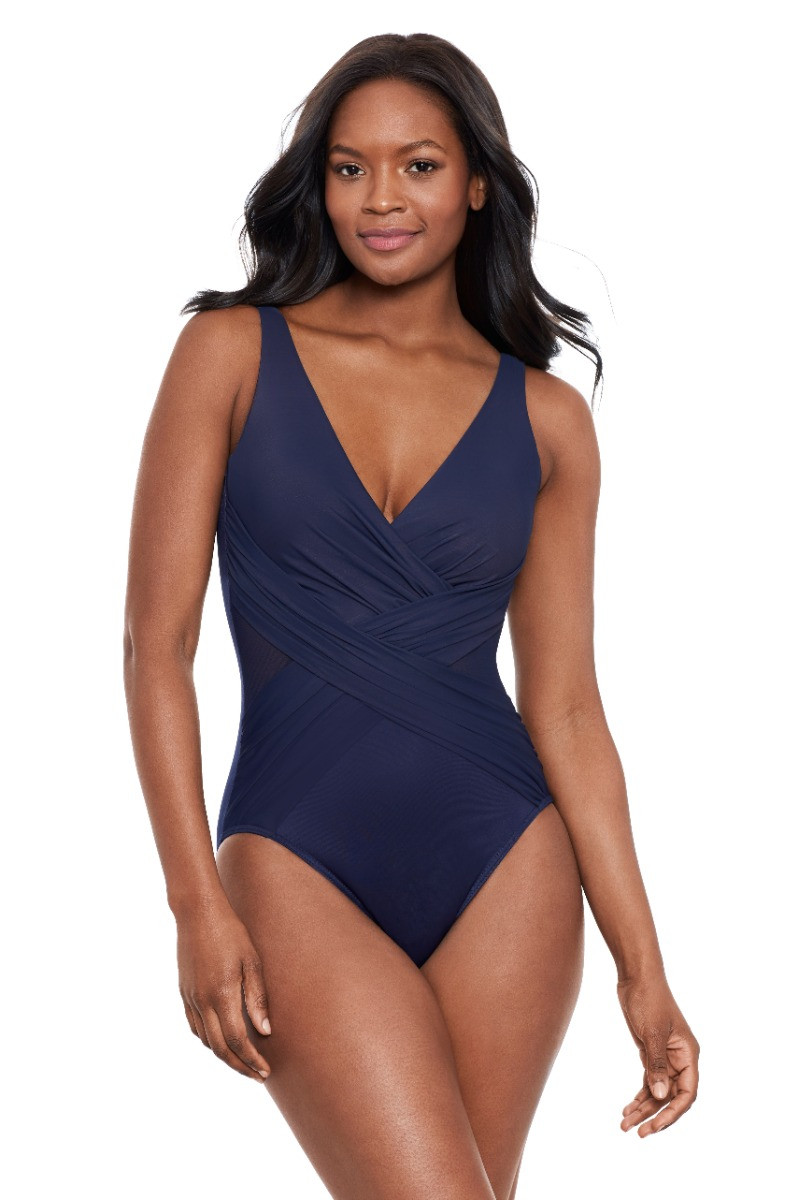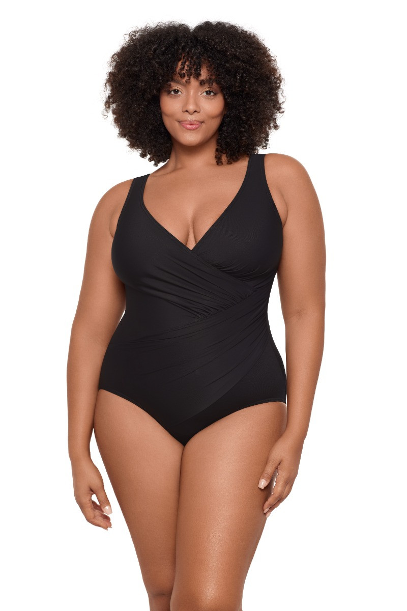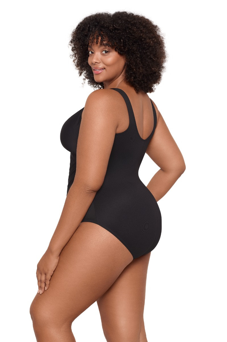 Om je figuur slanker te laten lijken, kun je kiezen voor corrigerende badpakken die het silhouet afslanken. Verticale prints leiden het oog van boven naar beneden, waardoor je slanker oogt. Horizontale prints laten de taille en schouders breder lijken. Donkere kleuren geven een slankend effect en kleurblokken maken de taille optisch smaller. Strategisch geplaatste prints, zoals op de buste, leiden de aandacht daarheen in plaats van naar de taille. Modellen met een hoge beenuitsnijding of diepe halslijn zorgen voor een langer en slanker silhouet.