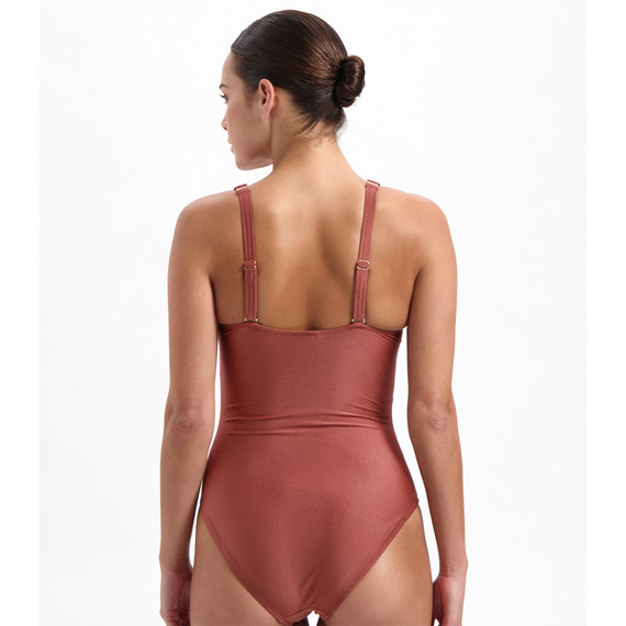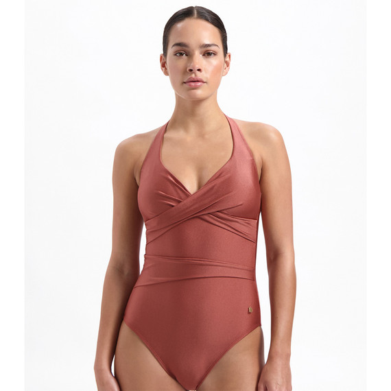 Het Chocolate Shine overslag badpak van Beachlife is uitgevoerd in een roestbruine kleur. Deze zachte kleur staat prachtig op de zongebruinde huid! Dit trendy badpak heeft een lichte padding in de cups waardoor de borsten een mooie ronde vorm krijgen. Het twistdetail aan de voorkant zorgt voor een mooi decolleté. De schouderbandjes zijn recht, gekruist en als halter te dragen. Combineer dit badpak met jouw favoriete strandaccessoires van Beachlife.
