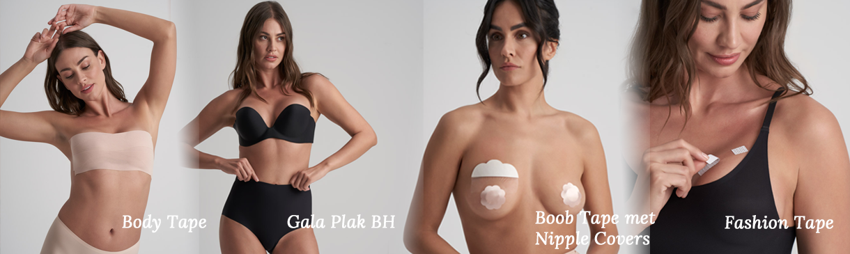 De collectie van Bye Bra bevat verschillende producten voor iedere gelegenheid. Denk hierbij aan plak BH's, tape, fashion tape, tepelcovers, BH-clips, BH-verlengstukken en shapewear. Zo zijn de plak BH's perfect onder een strapless jurkje of een backless top. De cupmaten variëren van cup A tot E, met als uitzondering de Glam Bra, die loopt van cup C tot G. De plak BH's zijn tot wel 25 keer te gebruiken! Ook tape is een perfecte oplossing voor onder verschillende kledingstukken. Tape kan op verschillende manieren worden geplakt en is daardoor aanpasbaar aan je eigen borsten en het kledingstuk dat je wilt dragen. De tape is water-, zweet- en feestbestendig, ideaal voor de zomer dus!