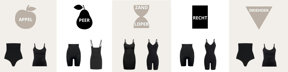 Vrouwen met een appelfiguur dragen hun gewicht vooral rondom de buik en taille en willen vaak een slankere taille creëren. Een peervormig figuur heeft meer volume bij de heupen, billen en dijen en wil deze zones optisch smaller laten lijken. Een zandloperfiguur richt zich vooral op het creëren van een glad en egaal silhouet. Rechtvormige figuren hebben weinig taille, maar met shapewear kan juist meer vorm en definitie worden gecreëerd. Een (omgekeerd) driehoekig figuur heeft vaak een breder bovenlichaam met grotere borsten met de juiste shapewear kan dit visueel meer in balans worden gebracht.