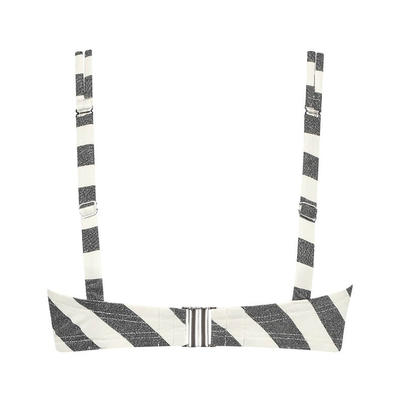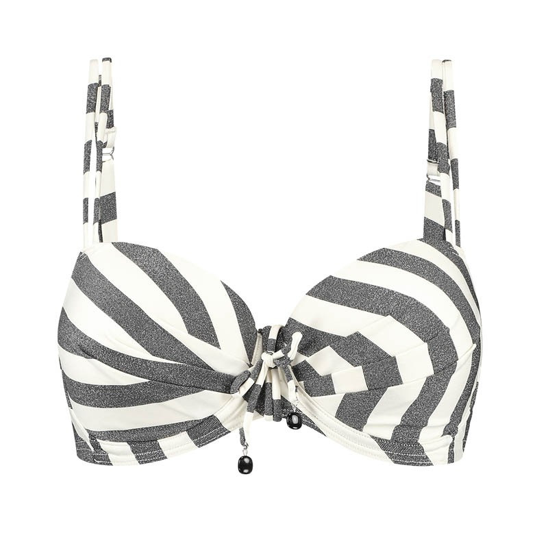 De Glitz bandeau bikinitop van Cyell is uitgevoerd in een crèmekleur met gestreept print. De bandeau bikinitop heeft zwarte strepen, verfraaid met zilveren glitters voor een elegante en opvallende look. De cups van deze bikinitop zijn voorgevormd en zorgen voor een mooie ronde borstvorm. Deze bikinitop kan op verschillende manieren worden gedragen: recht, halter en strapless. Het strikdetail tussen de cups maakt de bikinitop helemaal af. Combineer deze bikinitop met een van de bijpassende bikinibroekjes.