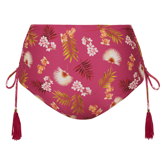Het Wild Orchid hoge bikinibroekje heeft een prachtige zomerse bloemenprint op een fuchsia basiskleur. Aan de zijkanten van dit bikinibroekje zitten speelse touwtjes waarmee je zelf de hoogte van het broekje kunt bepalen. Het broekje heeft een hoge taille die een eventueel buikje verhult. Combineer dit zomerse bikinibroekje met een van de tops en strandaccessoires van de Wild Orchid serie om je look compleet te maken. Wild Orchid is een lust voor het oog!