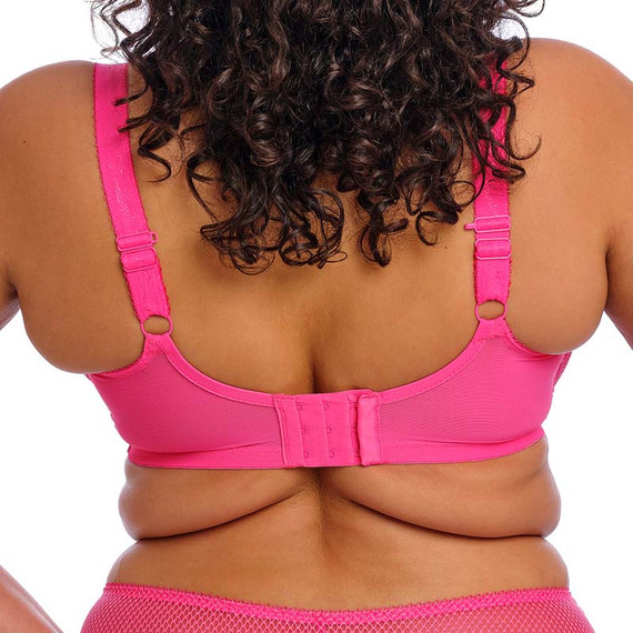 De Charley beugel BH van Elomi is uitgevoerd in de kleur Pink. De cups van deze sexy BH zijn versierd met een ruitvormige meshstof. Bovenaan de cups zit een transparant deel gemaakt van prachtig kant. Op het kant zijn roze borduursels verwerkt. De subtiele metallic draad zorgt voor een luxe uitstraling. De stevige cups bevatten side-support, waardoor je borsten mooi naar voren worden gecentreerd. Tussen de cups en op de schouderbandjes is een strikdetail verwerkt. De BH bevat een haakje achter op de schouderbandjes waardoor de schouderbandjes aan elkaar kunnen worden bevestigd. Combineer deze BH met een van de bijpassende slips.