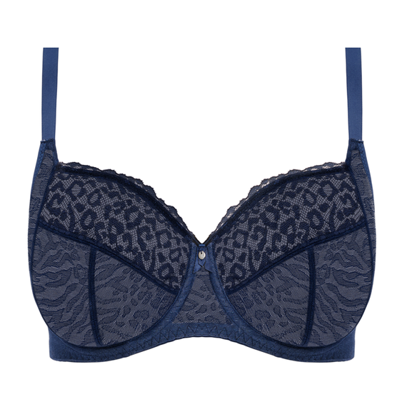 De Catwalk beugel BH van Freya is uitgevoerd in de kleur Midnight. Deze donkerblauwe BH verleidt met haar prachtige kant en borduurwerken. De avontuurlijke dierenprint wordt stijlvol gecombineerd voor een sensuele touch. De zachte cups zijn voorzien van side support waardoor de borsten worden gecentreerd en ondersteunt voor een mooi decolleté. Daarnaast sluiten de cups wat hoger op de borst aan, voor een comfortabel draagcomfort. Draag de schouderbandjes recht of als racerback door het haakje op de rug. Het strikje tussen de cups maakt de BH af. Combineer deze BH met een van de Catwalk slips.