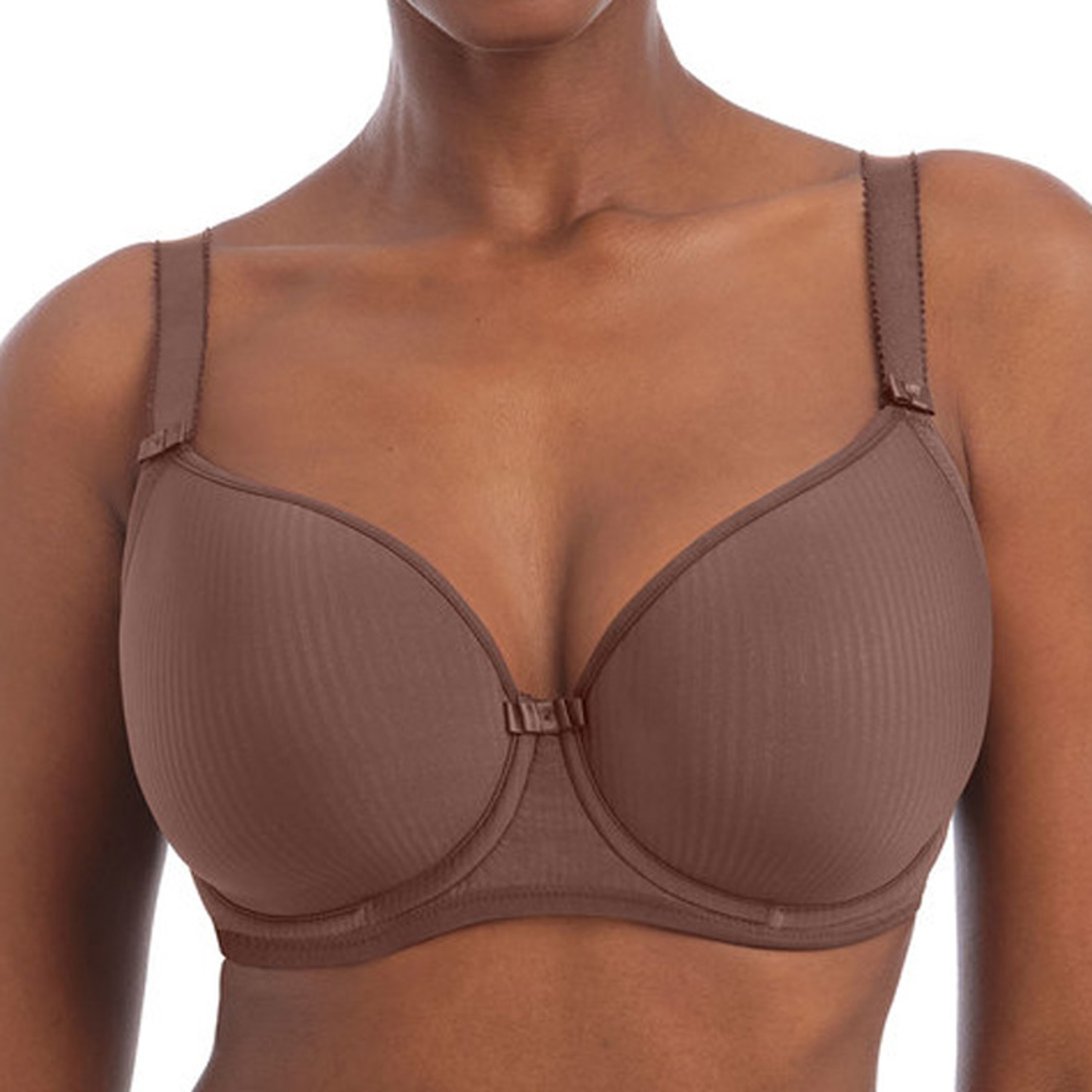 De Idol voorgevormde BH van Freya is uitgevoerd in de kleur Cinnamon. Deze klassieke BH is voorzien van een subtiel ingeweven streepdessin. Het middenstuk sluit hoger aan op het borstbeen waardoor de BH een stevige pasvorm krijgt. De gladde voorgevormde cups omvatten de borst en geven ze een natuurlijke ronde vorm. Door de naadloze afwerking draagt de BH onzichtbaar onder strakke tops. Tussen de cups en op de schouderbandjes zijn subtiele strikjes verwerkt. Combineer deze BH met een bijpassende slip. De Idol collectie is een prachtige basis in elke lingerielade.