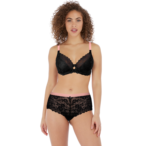 De Offbeat plunge BH van Freya is uitgevoerd in de kleur Black. Deze prachtige zwarte BH heeft roze schouderbandjes. De cups zijn gemaakt van stevig materiaal, waardoor je borsten mooi naar voren worden gecentreerd. De cups zijn versierd met een prachtige kanten bloemenbroderie. Tussen de cups zit een opengewerkt detail wat de BH helemaal af maakt!