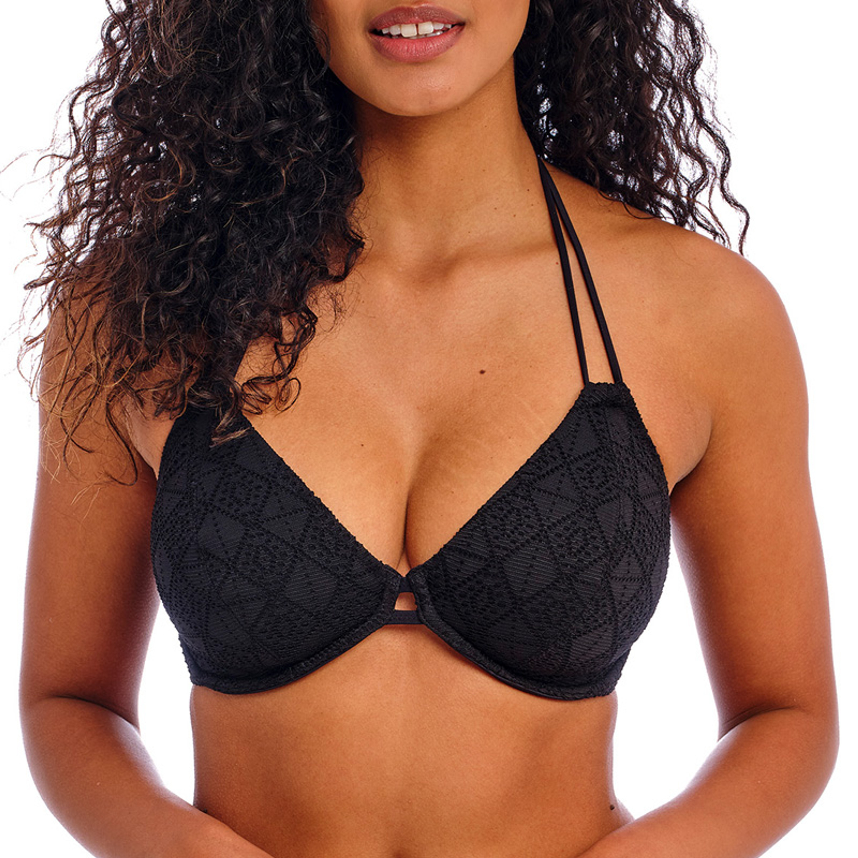 De Nomad Nights halter bikinitop van Freya Swim is uitgevoerd in de kleur Lava. Deze opvallende bikinitop is gemaakt van gerecyclede garens en heeft een gehaakte stof met een uniek ruitjesdesign. De diep uitgesneden cups zorgen voor een mooie, subtiele lift en geven je een prachtig decolleté. Combineer deze bikinitop met een van de bijpassende bikinibroekjes voor een complete en stijlvolle strandlook.
