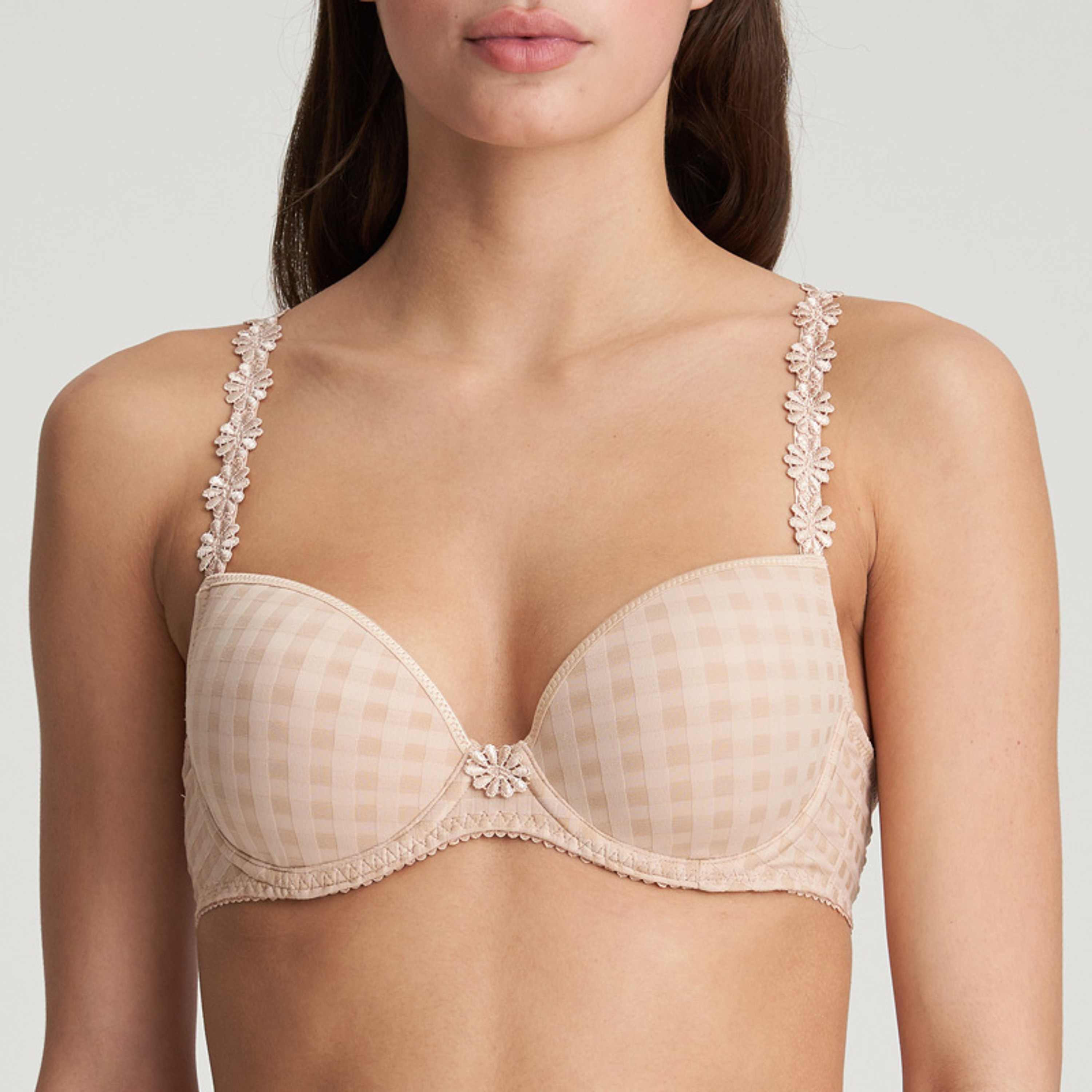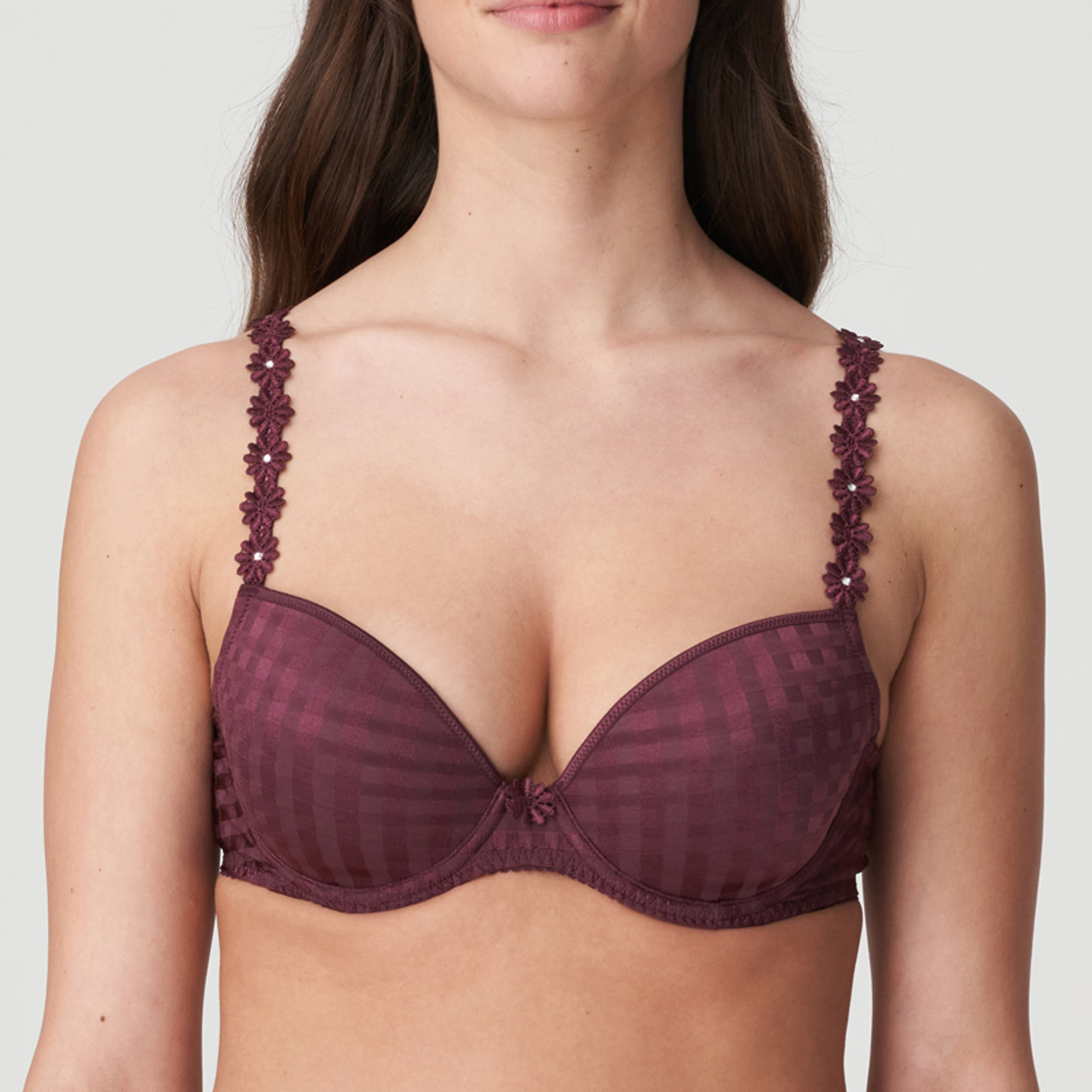 De Avero voorgevormde BH van Marie Jo is uitgevoerd in de kleur Scarlet. Deze rode BH is voorzien van een trendy ruitjesprint met een glanzende afwerking. De BH is laag uitgesneden en de voorgevormde cups geven de borsten een natuurlijke ronde vorm. Door de naadloze afwerking draagt de BH onzichtbaar onder je kleding. De sierlijke schouderbandjes bestaan uit kleine madeliefjes. Het madeliefje tussen de cups maakt deze BH af. Combineer deze BH met een van de bijpassende slips.