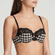 De Ely voorgevormde balconette BH is uitgevoerd in de kleur Zwart. Deze BH heeft een leuk zwart wit ruitjespatroon met een goudkleurig accent. Het randje met zwart kant boven de cups geeft deze BH een sexy touch. Het strikje in het midden maakt deze Ely BH helemaal af! Combineer deze BH met een slip uit de serie.