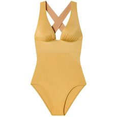 Het Capri badpak van Pain de Sucre is uitgevoerd in de kleur Satine Navy. Dit badpak met racerback is voorzien van brede, gevoerde en elegant gerimpelde cups die het decolleté prachtig accentueren. De diepe halslijnen aan zowel de voor- als achterkant zorgen voor een vrouwelijke uitstraling, terwijl de bandjes, gekruist in het midden van de schouders, bijdragen aan een sportieve en dynamische look. Combineer dit badpak met de bijpassende strandaccessoires voor een complete look.