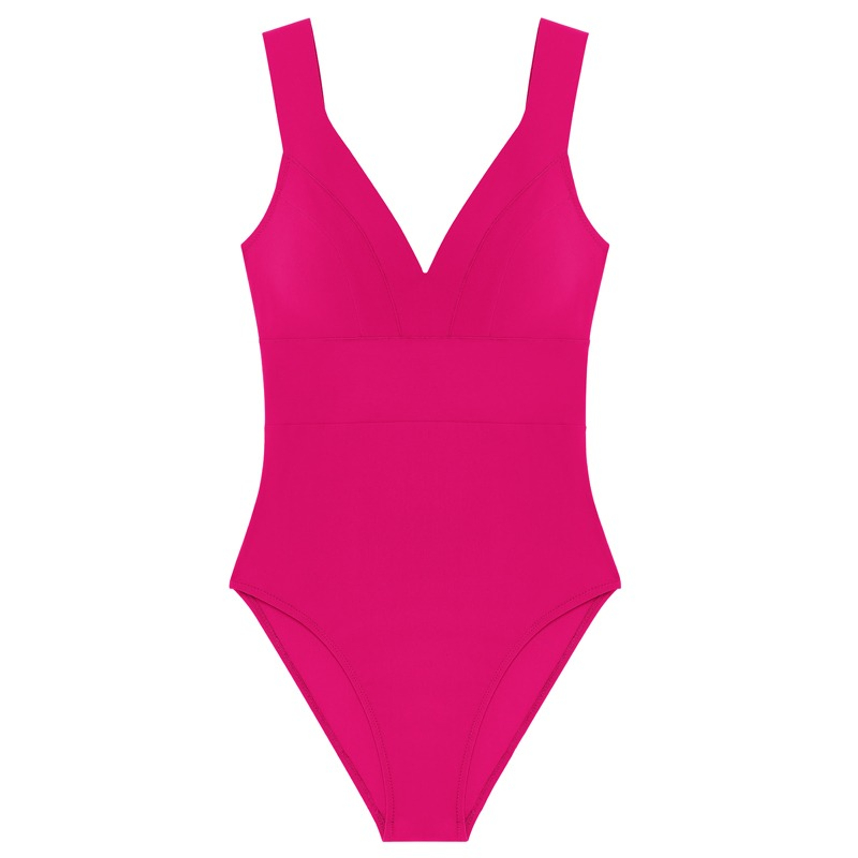 Het Pipper badpak van Pain de Sucre is uitgevoerd in de kleur Noir. Dit zwarte badpak heeft een V-halslijn aan zowel de voor- als achterkant. De gebonden afwerking bij de halslijn, bandjes en de brede band onder de buste zorgt voor optimale ondersteuning en een comfortabele pasvorm, ook voor vollere bustes. Stijlvol en bedekkend accentueert het Pipper badpak de rondingen op een subtiele manier. De zorgvuldig geplaatste snitten en verfijnde afwerkingen geven het silhouet en de borsten extra volume. Combineer dit badpak met de bijpassende strandaccessoires voor een complete look.