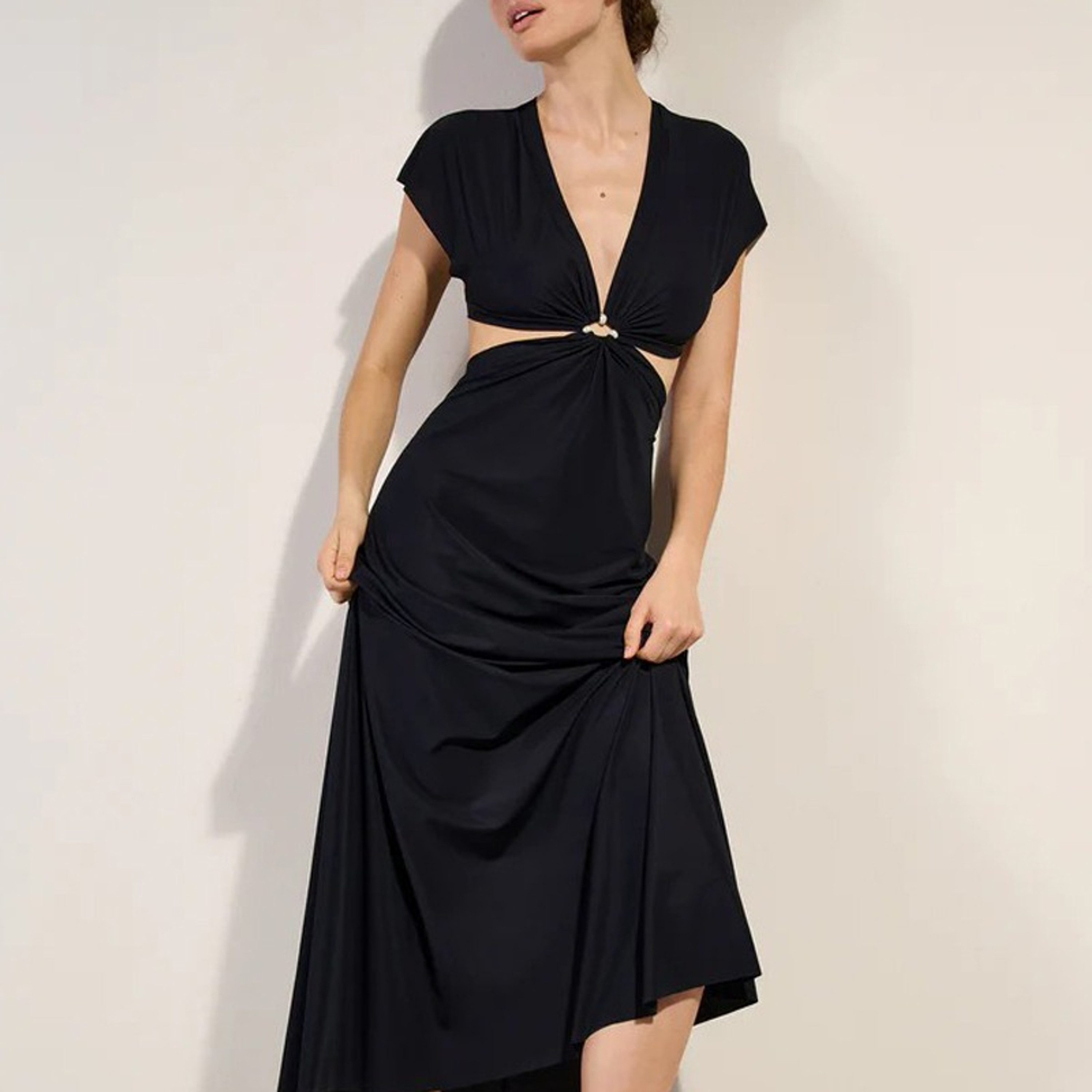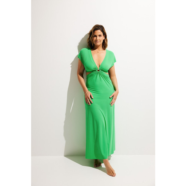 De Rislene strandjurk van Pain de Sucre is uitgevoerd in de kleur Pomme. Deze lange, wijd uitlopende jurk is perfect voor op het strand of als luchtige zomerjurk. De jurk heeft een ruime halslijn aan de voorkant en een open rug aan de onderzijde, afgewerkt met drie parelmoeren knopen op de ronde opening onder de borst. Korte mouwen en een vrije snit maken het geheel luchtig en comfortabel. Combineer met de bijpassende badmode van Pain de Sucre voor een complete look.