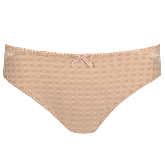 De Madison rioslip van PrimaDonna is uitgevoerd in de kleur Caffé Latte. Deze beige slip heeft een ruitjesstof en is aan de zijkanten en bij de billen afgewerkt met kant. De slip is vrij hoog uitgesneden aan de zijkanten, waardoor je benen optisch langer lijken. De Madison serie is erg populair onder PrimaDonna fans. De combinatie van ruitjes en kant geeft deze serie een jonge en elegante uitstraling!