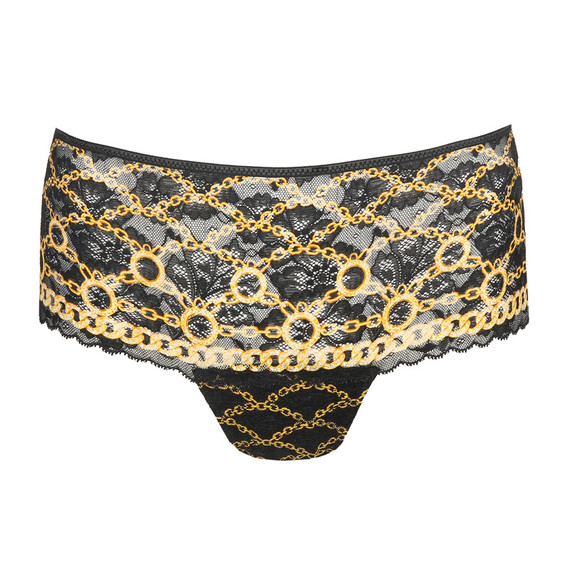 De Amsterdam Av hotpants van PrimaDonna Twist is uitgevoerd in de kleur Zwart. Deze zwarte slip is een absolute "one of a kind". De hotpants is gemaakt van sexy kant en voorzien van een unieke fotoprint van gouden schakels en kettingen. De achterkant is naadloos afgewerkt en versierd met een gouden sieraad die de look compleet maakt. Combineer deze hotpants met een van de bijpassende BH's. Dare to wow!
