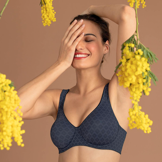De Twin Art beugel BH van Rosa Faia is uitgevoerd in de kleur Shadow Blue. Deze donkerblauwe ademende stof heeft een speelse print. Deze Twin BH maakt al meer dan 10 jaar onderdeel uit van de Rosa Faia collectie. De dubbellaagse cups dragen erg comfortabel. Door de naadloze verwerking is deze BH absoluut onzichtbaar onder T-shirts.