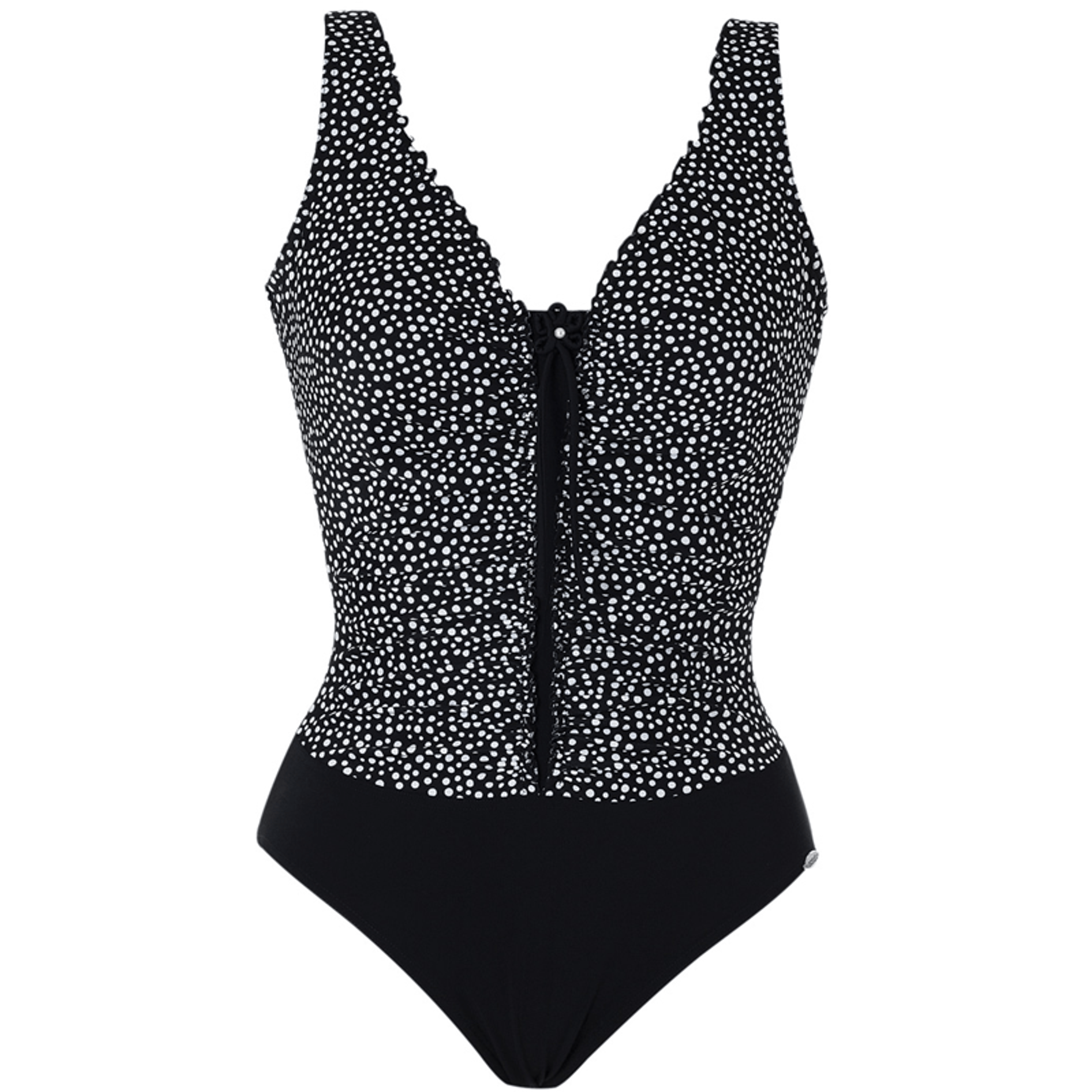 Het badpak van Sunflair is uitgevoerd in de kleur Blauw. Dit trendy badpak is voorzien van een abstract patroon van blauw- en bruintinten. In het midden van het badpak zit een speelse gerafelde rand. De stof is in het midden geplooid waardoor het badpak meer structuur krijgt en oneffenheden worden verhult. De achterkant van het badpak heeft een diepe, open rug. Combineer dit badpak met je favoriete strandjurk.